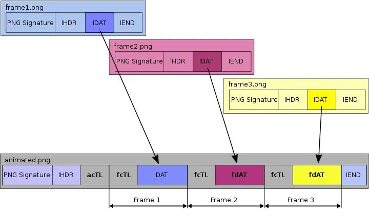 为了解决这几个问题,我们开始研究APNG的文件格式结构,包括PNG的结构和扩展的acTL(动画控制块)、fcTL(帧控制块)、fdAT(帧数据块)。